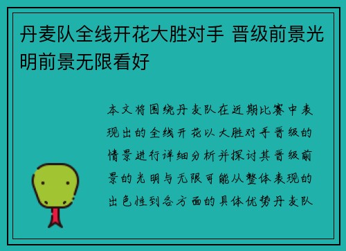 本文将围绕丹麦队在近期比赛中表现出的全线...